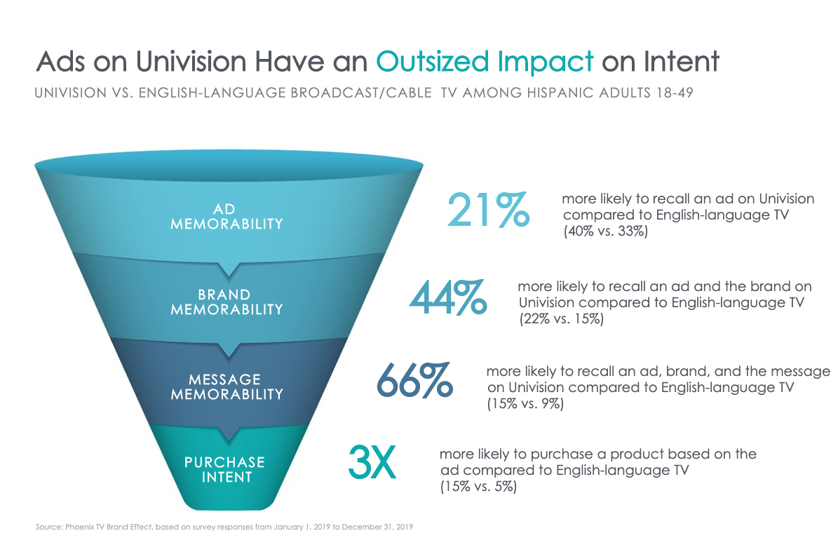 Even before the release of the Nielsen study, we had proof that Univision delivers the business results brands seek across the purchase funnel. For example, when compared to English-language TV, ads on Univision have an outsized impact in terms of consideration and purchase intent. Indeed, the influence of ads on Univision grows to the point where our viewers are 3X more likely than English-language viewers to purchase a product or brand [2]. How is that for accelerated growth?